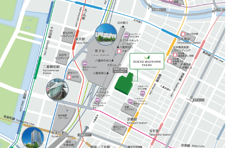 JR「東京」駅 地下直結(八重洲地下街経由)、東京メトロ丸の内線「東京」駅 地下直結(八重洲地下街経由)